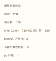 下面是我开发的颗粒系统抗裂砂浆成熟配方, 已经有200万的施工面积论证,考虑目前市场成本价格太高,而我这个价格非常低的,特贡献出来给技术组各同行交流参考!禁止出卖!谢谢合作! 抗裂砂浆配方: 水泥180 重钙50 膨胀剂15 引气剂1 纤维素醚1 砂740 胶粉8 纤维0.5 总计1005.5www.drymt.com